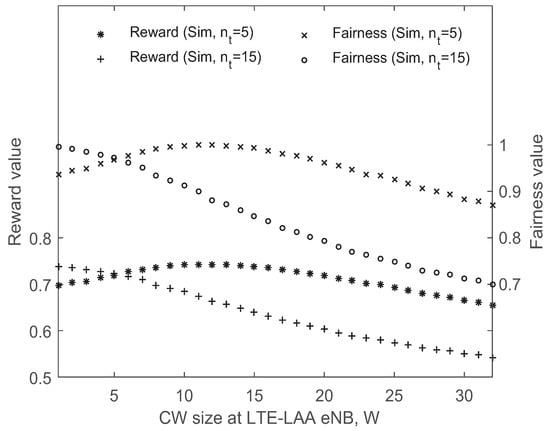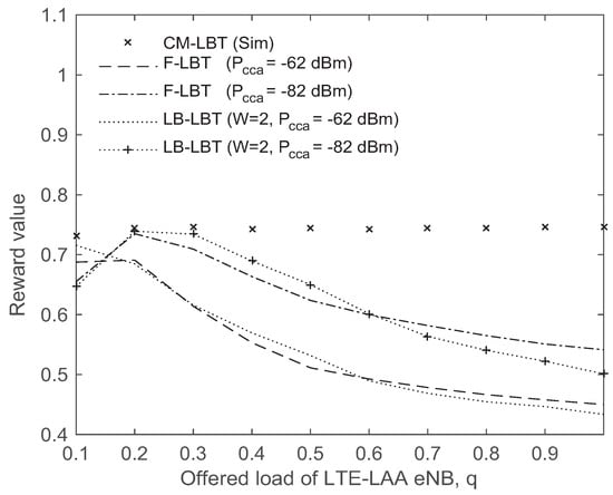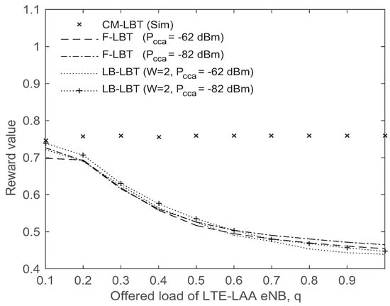 Note that CM-LBT guarantees the fairness between LTE-LAA and WLAN by adaptively adjusting W and parameters. Conversely, in both F-LBT and LB-LBT, when q increases, the WLAN throughput decreases, whereas that of the LTE-LAA system largely increases. As a result, the fairness in both F-LBT and LB-LBT decreases with an increase in q. Meanwhile, when 15, the reward value is greater for dBm than for dBm in both F-LBT and LB-LBT, as shown in Figure 7. This can be attributed to the fact that when , the number of WLAN basic service sets in the CCA range is larger for dBm than for dBm. Consequently, in both F-LBT and LB-LBT, the fairness in the case of dBm is improved because the gap between the throughputs achieved by LTE-LAA and WLAN is reduced when compared to the case of dBm.