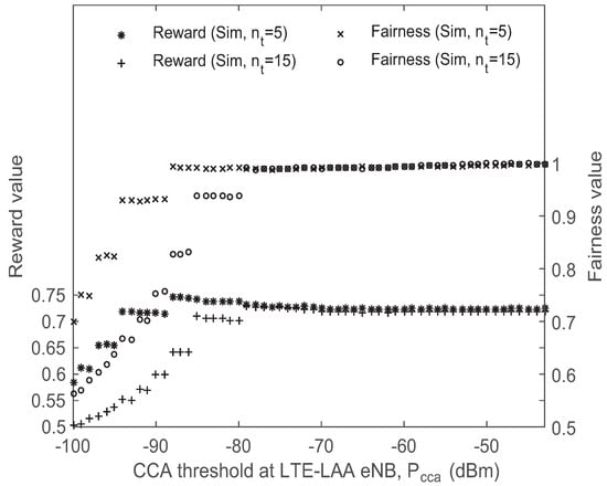 In this section, we present comparative simulation results of CM-LBT, F-LBT, and the conventional LB-LBT with a fixed contention window size and fixed CCA threshold, in terms of fairness, and reward value as described in Section 3.3. We developed a simulation program in C++ to model the CM-LBT, F-LBT, and conventional LB-LBT schemes, focusing primarily on their medium access control protocols. The CM-LBT scheme was implemented based on the operations described in Section 3, the F-LBT scheme followed the operations outlined in [5], and the conventional LB-LBT scheme was implemented according to the operations detailed in [7,8]. We consider the coexistence network scenario presented in Figure 3. In this scenario, one LTE-LAA small cell coexists with multiple WLAN APs at a 5.8-GHz carrier frequency over a 20-MHz bandwidth. For the LTE-LAA system, LTE-LAA devices are uniformly located within the cell with a radius of for downlink transmissions. We assume equals 10. For the WLAN system, APs are uniformly distributed within the LTE-LAA cell, where is set to 5 or 15. The number of WLAN nodes associated with each AP equals 5. The urban micro (UMi) non-line-of-sight (NLOS) for a hexagonal cell layout model is used to predict the path loss (PL) [25]. With r and denoting the distance in meters, and the carrier frequency in GHz, (dB). We can then obtain the corresponding values of and in Equation (11) [19].