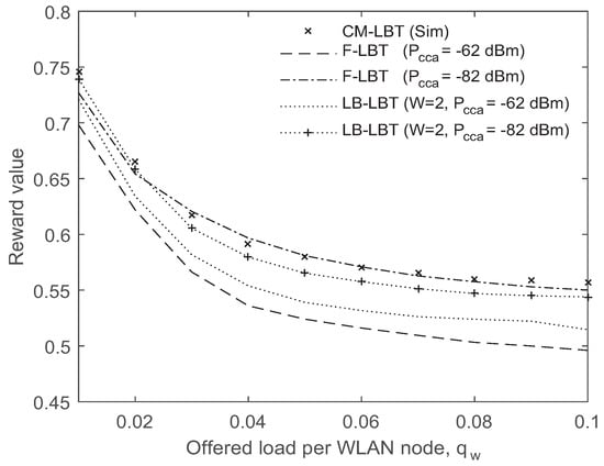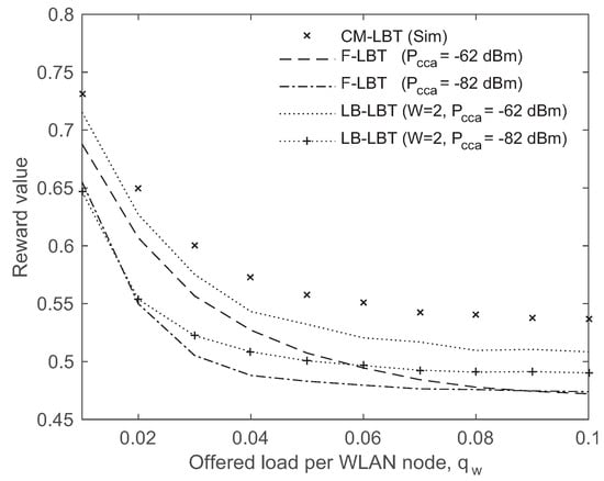 Lastly, Figure 8 and Figure 9 plot the reward results of CM-LBT, F-LBT, and LB-LBT under different offered loads per WLAN node, . We assume q equals 0.1. We see from Figure 8 that CM-LBT can improve the reward values in F-LBT and LB-LBT. Specifically, when , the reward value in CM-LBT is increased on average by 0.1 and 0.01 times compared to F-LBT with −62 and −82 dBm, respectively, and by 0.07 and 0.02 times as compared to LB-LBT with −62 and −82 dBm. In the case of , CM-LBT outperforms F-LBT and LB-LBT. As shown in Figure 9, it improves the reward result of F-LBT with −62 and −82 dBm by 0.1 and 0.15 times, and the reward of LB-LBT with −62 and −82 dBm by 0.05 and 0.12 times.