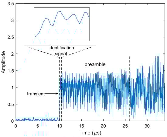 Since there may be different transient durations among the various transmitters operating in the same transmission standard [4,6], determining a single duration is challenging. In the literature, there are studies that determine the duration by visual inspection [3] or through an empirical approach [6]. In this study, we use identification signals that contain transients and have a constant length determined experimentally. We refer to these signals as transient-based identification signals, which are considerably shorter in duration compared to preamble signals, as seen in Figure 2.