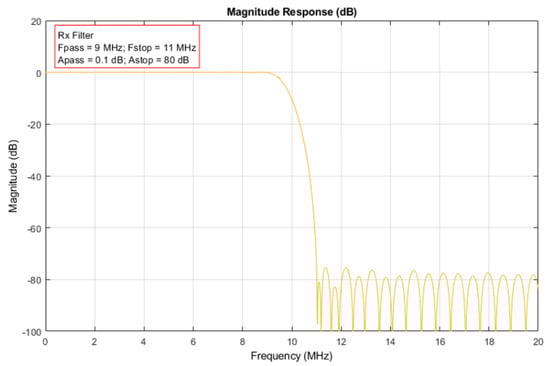 Because of the restrictions imposed on the output power of transmitters, spectral components outside the transmission bandwidth will be significantly attenuated. Extracting RF fingerprints from outside the transmission bandwidth may become impractical due to background noise and signals in adjacent channels. Therefore, filter chain parameters were determined by considering transmitted spectrum. RF bandwidth was set as close as possible to 18 MHz, which is 0 dBr bandwidth of Wi-Fi transmitters, and the bandwidth of the analog low-pass filter was defined accordingly. An FIR filter was designed with a passband frequency of 9 MHz and a stopband frequency of 11 MHz. The design of the receiver filter chain of AD9363 was performed using the MATLAB application developed by Analog Devices [28,32]. The designed filter characteristics for a sampling rate of 40 MS/s are shown in Figure 4. The designed filter chain is separately applied to real-valued in-phase and quadrature signals obtained from the SDR receiver. The results of classification performance for Wi-Fi signals obtained by using both default and designed filter chains are presented in Section 5.2.