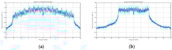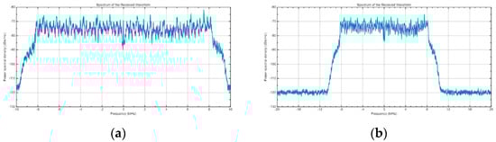 In order to see the effects of the default and designed filters on the spectrum of the received signals, power spectral densities of the signals obtained by using the corresponding filters at sampling rates of 20 MS/s and 40 MS/s are given in Figure 5 and Figure 6. As illustrated in Figure 5a,b, the default filter chain distorts the spectral components of the signal near the bandwidth edges at a sampling rate of 20 MS/s, while inadequately filtering the out-of-band components at a sampling rate of 40 MS/s. On the other hand, for the designed filter, the desired signal spectrum is obtained without distortion and with significant attenuation of out-of-band components for both sampling rates, as shown in Figure 6a,b.