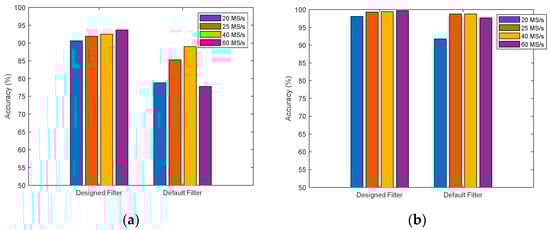 With proper filter design according to the IEEE 802.11n signals, the classification performance is superior to that of the default filter chain at all sampling rates for both SNR levels. This result shows that the proper filter design prevents distortion on RF fingerprints. The performance improvement achieved with the designed filter is remarkable at the lower SNR value, as seen in Figure 7a. With the designed filter, classification accuracies are approximately 92% and 99% at sampling rates exceeding 2.5 times the baseband bandwidth for SNR values of 15 dB and 30 dB, respectively.