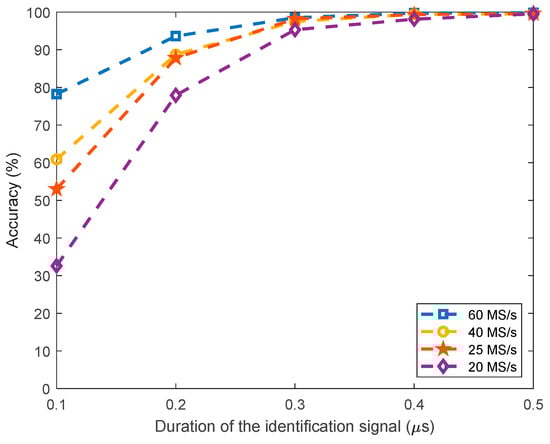 For the 30 dB SNR value, as illustrated in Figure 9, classification performance is similarly affected by the sampling rate and signal duration, as observed in the lower SNR scenario. It is evident that a shorter signal duration is sufficient to attain high classification performance at 30 dB SNR. Specifically, with a signal duration of 0.4 µs, classification performance approaches 99% across all sampling rates, even at the Nyquist limit. As SNR increases, the duration of the identification signal required to acquire the achievable performance decreases approximately at a ratio of 2/3.