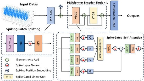 Overview of the SGSAFormer network. The overall architecture is similar to that in Spikeformer, but two parts have been changed. First, we designed Spike Gated Linear Unit (SGLU) to replace the Multi-layer perceptron (MLP) structure in the Spikeformer encoder. Second, we propose the Spike Gated Self-Attention (SGSA) module to replace the original Spike Self-Attention (SSA) module. Our network introduces the gating mechanism with the purpose of using the gating mechanism to control the complex spatio-temporal information in the Spiking neural networks (SNNs).