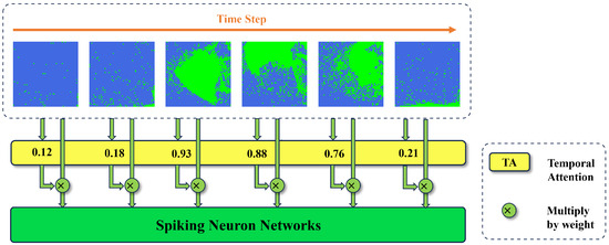 Dynamic vision sensors (DVS) are different from conventional cameras in that DVS cameras do not capture static images but generate a stream of events by monitoring the change in brightness of each pixel. With their high temporal resolution, low latency, and low power consumption, DVS cameras have excelled in the fields of autonomous driving and motion recognition. Due to the asynchronous event-driven nature of SNNs, they have an advantage over ANNs in processing DVS data. SNNs use the data from the DVS event camera and first integrate it in time to form a stream of frames on the timeline. Since the DVS event camera records the part of the change that occurs to generate the event, the more events that a given frame of data represents, the more change that occurs at that moment in time. Biologically, the human eye tends to focus more on actions or events with more changes in the field of view, so a TA module is proposed to assign weights to time frames based on the number of events in the input time frames, allowing the model to better focus on time frames containing a greater number of events, and the structure of the TA module is shown in Figure 2.