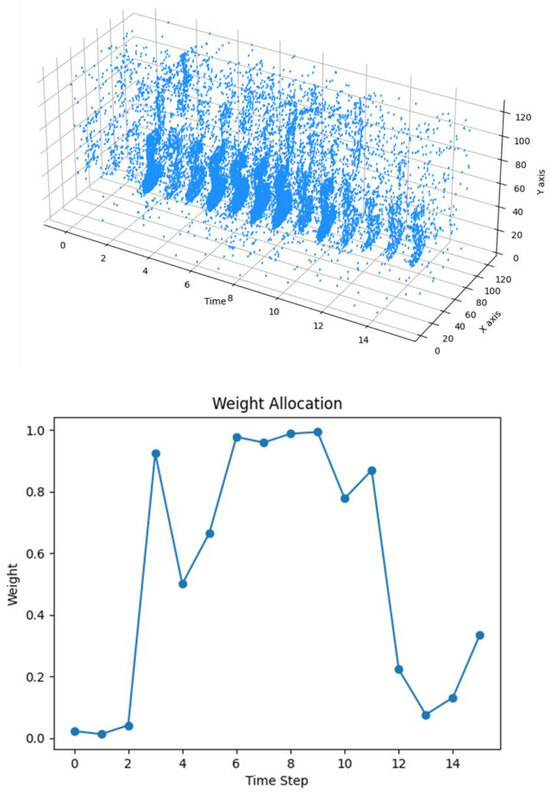 This is a visualization of the TA module’s weight assignment. The top shows the input data integrated into temporal frames, and the bottom shows the weights assigned to each temporal frame. Frames in the input data containing more events are assigned higher weights, while frames with fewer events are assigned lower weights.