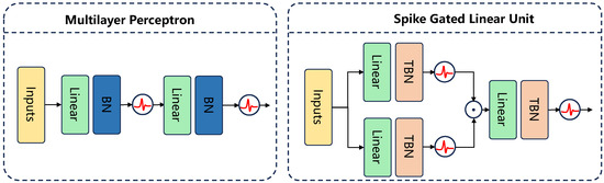 where Linear is the fully connected layer, TBN is the time-dimension batch normalization layer, and SN is the spike neuron layer. SGLU is an improved spike MLP with the addition of a gating mechanism that improves the expressive power of the model.