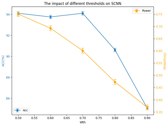 Testing the impact of using TA modules with different thresholds in the spiking convolutional neural network (SCNN). By balancing the effects of the TA threshold on the network’s performance and energy consumption, an appropriate threshold is selected.