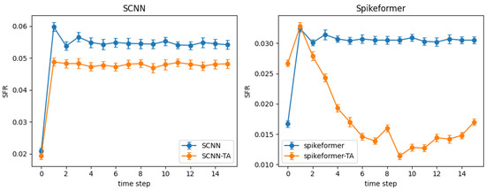 where denotes the SFR at model time step t, denotes the number of neurons firing spike at time step t, and denotes the total number of neurons in the model. The experimental results are shown in Figure 6. The SFR decreases when the TA module is added to both models. This is due to the fact that the TA module reduces the input of unimportant data. The decrease in SFR leads to a reduction in the computational effort of the model.