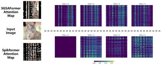From the experimental results, it can be seen that both the SGLU and SGSA modules improve the performance of the benchmark model at different time steps. The results of the ablation experiments confirm the effectiveness and reliability of the modules we proposed. In Figure 7, we show the attention map examples of the last encoder block in SGSAFormer and Spikformer. From the figure, it can be observed that SGSAFormer generates attention at the first time step, while Spikformer fails to generate attention at the first time step. Additionally, SGSAFormer is more effective than Spikformer in capturing image regions relevant to classification, demonstrating the enhanced role of the gating mechanism in the attention mechanism.