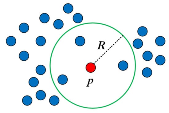 Distance-based anomaly: A data point in a dataset is a distance-based anomaly or distance-based outlier [] if the point does not have at least other points within a distance for user-defined parameters and . An example of a distance-based anomaly in two-dimensional space is shown in Figure 1. In this example, the point is a distance-based anomaly if the value of the parameter is specified as 4, i.e., . Here, has only three other points, excluding itself, within the specified distance from , i.e., the region bounded by the green circle with its center at . As has less than four (since ) points within the distance , it is a distance-based anomaly for . If the value of is specified to be 3, would not be a distance-based anomaly for the same distance as has three other points excluding itself within the green circle.
