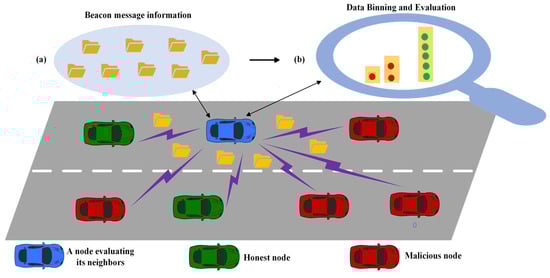 Attack model: A malicious node broadcasts a speed value lower than its real speed in the beacon messages [] to create the illusion of traffic congestion or an emergency event such as an accident. A vehicle analyzes beacon messages received from all the vehicles in its communication range to detect false information. It is assumed that the majority of vehicles are honest, as considered in the literature [,].