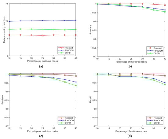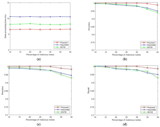 Results for the urban scenario: (a) Data processing time vs. percentage of malicious nodes; (b) accuracy vs. percentage of malicious nodes; (c) precision vs. percentage of malicious nodes; (d) recall vs. percentage of malicious nodes; (e) F1 score vs. percentage of malicious nodes; (f) FPR vs. percentage of malicious nodes.
