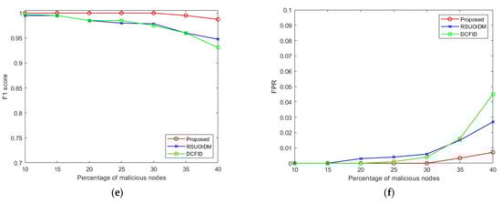 F1 score: The F1 score degrades slightly when the proportion of malicious nodes increases above 30% due to the marginal changes in precision and recall values in these cases. As seen in Figure 4e, the higher F1 score for our proposed technique than the RSUOIDM and DCFID techniques suggests that our technique can successfully detect the malicious nodes in the network without incorrectly classifying the honest nodes to be malicious.