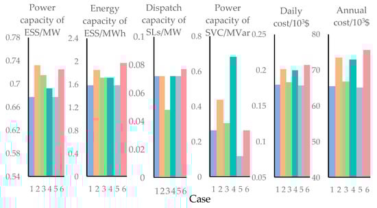 | Case | Power Capacity of ESS/MW | Energy Capacity of ESS/MWh | Dispatch Capacity of SLs/MW | Dispatch Capacity of RLs/MW | Power Capacity of SVC/MVar | Daily Cost /USD | Annual Cost /USD |