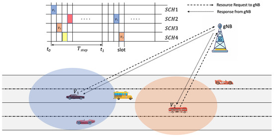 5G NR V2X SL can operate in Mode 1, which uses centralized resource allocation, or in Mode 2, which uses autonomous resource allocation. As in LTE-V2X Mode 3, the cellular infrastructure (particularly the base station denoted in 5G NR as gNB (Next-Generation Node B) manages the selection of radio resources for SL communications in NR-V2X Mode 1 using Dynamic Grant (DG) or Configure Grant (CG) resource allocation techniques [7]. The User Equipment (UE) that applies the DG technique sends a scheduling request to the nearest gNB for each transmission of an awareness message [8]. Figure 1 shows an example of the model of the NR V2X Mode 1 system. Vehicles and are located inside the coverage area of the gNB that is responsible for the management of resource allocation in this part of the network. Each vehicle in the network sends a resource request to the gNB in each transmission of the awareness message to the surrounding vehicles in its coverage area (see and ). The 5G gNB is responsible for selecting the appropriate radio resource and informing the vehicle about it. Due to the continuity of receiving and transmitting, this resource allocation procedure is known as dynamic grant-centralized resource allocation. The resource grid in centralized resource management is the gNB’s vision of radio resource distribution and use by the vehicles in the network in the frequency (subchannels) and time domains (slots). In our paper, we report the results of our investigations assuming this system model.