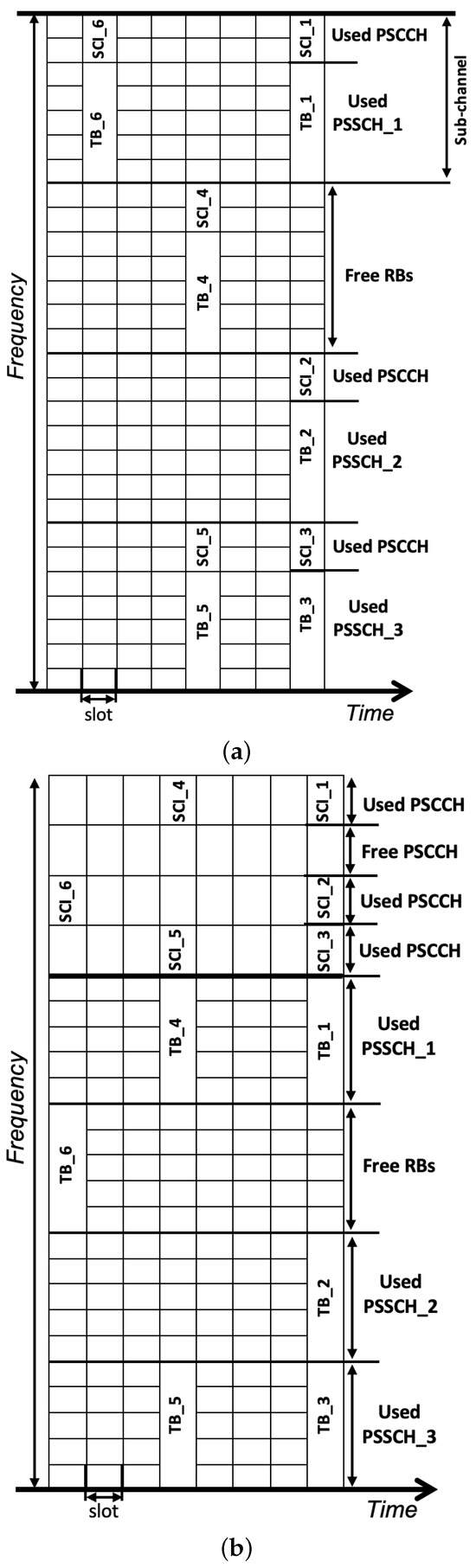 In V2X SL, each awareness message consists of two parts. The first part is Sidelink Control Information (SCI), transmitted in two adjacent RBs to carry information that helps the receiver decode the second part of the awareness message. SCI is transmitted through the Physical Sidelink Control Channel (PSCCH). The second part of the message is the Transport Block (TB), which consists of a fixed number of RBs. The Physical Sidelink Shared Channel (PSSCH) is the physical channel that contains a TB [10]. Both PSCCH and PSSCH physical channels can be transmitted in adjacent or non-adjacent configurations (see Figure 2a for adjacently configured subchannels and Figure 2b for non-adjacently configured subchannels). Despite that possibility, it is worth stressing that the fixed size of the configured subchannels is a serious limitation of the efficiency in the use of radio resources.