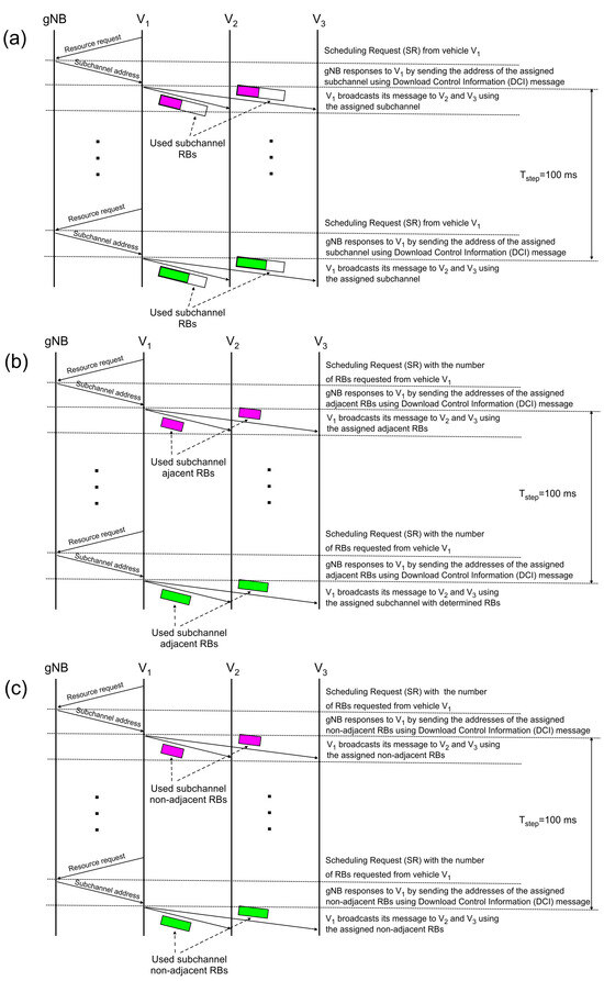 Figure 3 presents the message exchange between the base station gNB controlling the assignment of resources in its coverage area and the mobile stations located onboard the vehicles located in this area. Figure 3a shows the current procedure performed according to the 3GPP standard [7]. Figure 3b,c illustrate the message exchange for two algorithms presented in this paper. It is assumed that the terminal in vehicle initiates the request for resources, and when it receives them from the gNB, it broadcasts its messages to the neighboring terminals and . When comparing all three figures, it is evident that the proposed algorithms lead to savings in the assigned RBs, so potentially more terminals can be served within the coverage area. It is worth stressing that from the control point of view, the proposed algorithms require only small changes in the message containing the resource request.