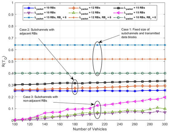 Figure 4 presents the results for the three investigated cases. The first case (Case 1) is characterized by a fixed subchannel size and a fixed amount of data that the vehicle needs to transmit (assuming it is equal to 6 RB). The wasted RBs in each subchannel, time slot, and duration are calculated by setting in (13) and (14) values of equal to 10, 12, and 15 RBs, values of equal to 0, 2, and 5, and equal to 6. The results show a massive waste of resources, regardless of the number of vehicles. The performance in Case 1 can be treated as a reference and benchmark for the two proposed algorithms, whose performance is much better.