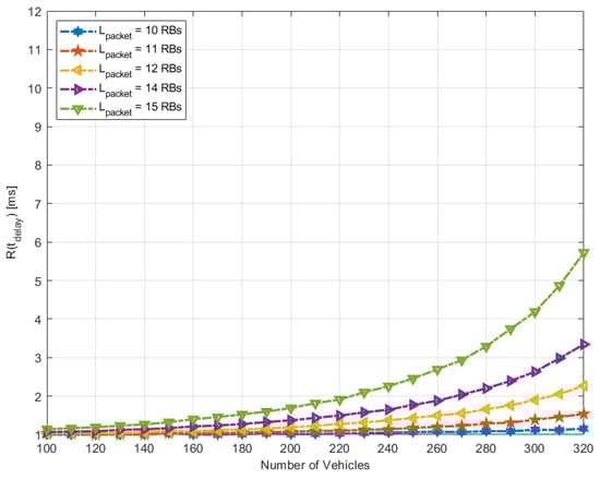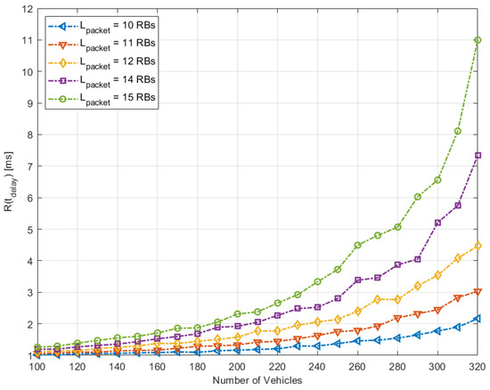 Figure 7 and Figure 8 show the average delay in resource allocation when both proposed algorithms are applied, respectively. Due to the varying number of resource blocks that a vehicle needs in each transmission, the availability of RBs in the next time interval depends on the load of the channel and the availability of free resources at that moment. Furthermore, an increase in the new value of can increase the probability of latency in resource selection according to (12).