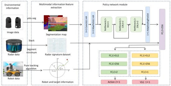 The mobile robot is equipped with sensors such as an IMU, depth camera, and LiDAR to collect information about both itself and the environment. In this paper, the state space for reinforcement learning includes processed LiDAR data , segmented image information , and the robot’s state information . These processed features will be input into the policy network to generate the corresponding actions. The specific methods for processing this information will be detailed in Section 3.3.