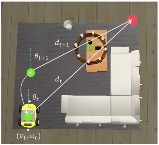 In real world environments, the output of mobile robots consists of continuous linear and angular velocities. The range of linear velocity is [0, 1] meters per second (since the actual robot’s maximum speed is 0.8 m per second, the output results will be scaled proportionally), and the range of angular velocity is [−1, 1] radians per second. The robot is controlled based on ROS (Robot Operating System). When the DRL (Deep Reinforcement Learning) algorithm provides an action output, it will be transmitted using the Twist standard message in ROS. As the control method for both simulation and actual robots is a four-wheel differential drive, they are capable of turning in place. Therefore, the x-axis linear velocity in the Twist message is set to the value of and the z-axis angular velocity is set to the value of . Once the message is sent to the robot’s underlying velocity controller, the robot will be able to travel at the given velocities.