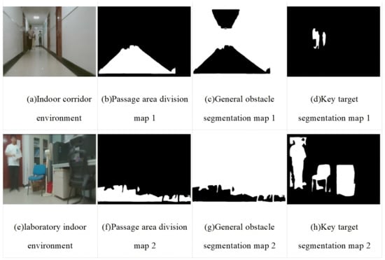 (1). Image segmentation technology is utilized to reduce interference from shadows, lighting, textures, and other factors in the images, thus narrowing the gap between reality and simulation. The images captured by the camera are segmented into three binary maps: passable areas, general obstacles, and critical obstacles, providing a comprehensive representation of the environment. This effectively addresses the significant difference between reality and simulation of the algorithm, allowing the model to be better deployed from the simulation environment to the real world environment.