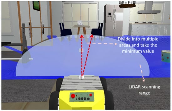 The data from LiDAR are relatively similar under real world and simulation conditions, with simple data features, and they are widely used in navigation and obstacle avoidance algorithms. In this paper, a model LD19 2D LiDAR is used, which is capable of measuring the distance and angle of obstacles. Typically, the number of points scanned by the LiDAR is set to an integer multiple of 180. However, in practical use, the actual number of scanning points of the LiDAR fluctuates between 448 and 452, and it may be set to NaN due to environmental material reasons, causing the LiDAR to fail to receive information. Since the input dimensions of the neural network need to be strictly fixed and cannot be NaN or Inf, and in order to reduce the input feature dimensions of the decision-making module, this paper will perform manual feature processing on the LiDAR perception information.
