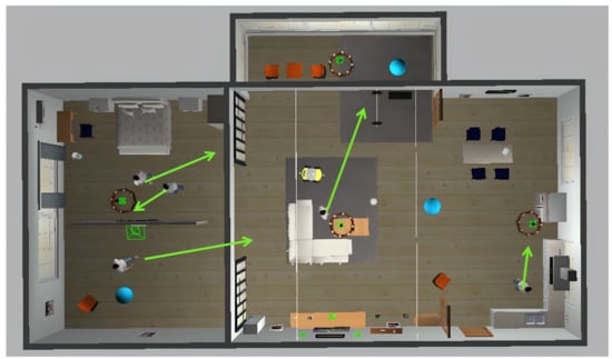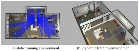 The training scenarios for this study were constructed using Gazebo, creating an indoor simulation environment. First is the static simulation environment, which measures 10 m × 20 m and includes basic obstacles such as bookshelves and sofas. The environment is set with 3–5 chairs and toys as random obstacles, whose positions vary randomly within a certain range. The starting position of the robot and the location of the target point are both random points that do not collide with obstacles, with a random starting angle. In the dynamic simulation environment, all other conditions remain the same, but pedestrians move within the scene along certain trajectories. The scene is depicted in Figure 6, where the green arrows indicate the direction and position of movement, which is based on the core simulation behavior of Pedsim.