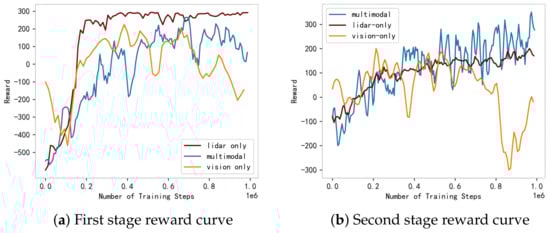 In this section, the PPO algorithm is used for multimodal fusion training, comparing the reward curves of using LiDAR data only, segmented image data only, and the multimodal fusion algorithm proposed in this paper, in addition to the robot’s state information. Using the curriculum learning approach, in the first phase, the training environment only contains static obstacles. The training results are shown in Figure 7a.