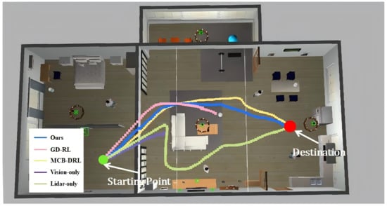 Each algorithm was tested 100 times in the corresponding scenarios, and the number of successful attempts, instances of getting lost, and collision occurrences were statistically recorded for each method under different environments. The collected data are presented in Table 3. Figure 9 shows the trajectory of a mobile robot in an indoor scene during one of the test runs.
