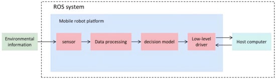 To test the generalization of the algorithm proposed in this paper and demonstrate its ability to better facilitate the transition from simulation to reality, a mobile robot obstacle avoidance experiment was conducted. In this paper, the deployment of deep reinforcement learning algorithms is realized based on ROS. The mobile robot platform and the upper computer platform are within the same ROS local area network, with each algorithmic function implemented as a node. The specific process is shown in Figure 10. The environmental information is sensed and transformed into standard ROS messages for information transmission. After data processing, the data are used as input for the deep reinforcement learning-based obstacle avoidance decision-making model, and the resulting speed commands for controlling the robot’s movement are transmitted to the STM32 underlying driver of the chassis to control the motor’s rotation. The upper computer can receive node topic information within the system and display it in software such as Rviz and Rqt. It can also directly publish speed information to control the platform.