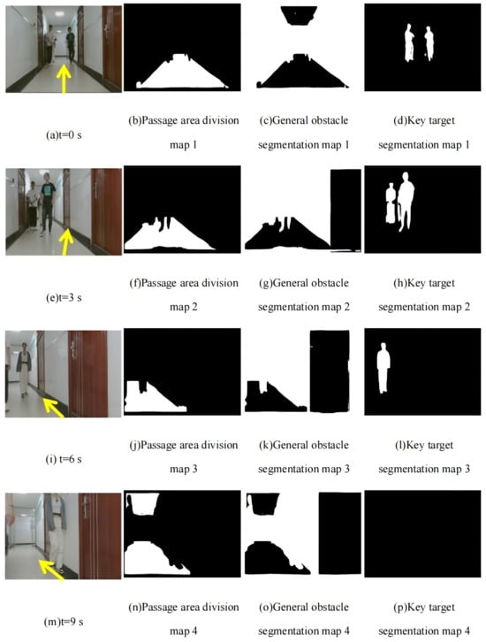 In this study, the segmented images will be processed into three types of segmentation maps based on the segmentation labels: first, a binary segmentation map of navigable and non-navigable areas, , which separates the navigable region from other background areas, indicating whether the path ahead is passable; second, a binary segmentation map for common obstacles, , which distinguishes common obstacles such as walls from the navigable area, representing the obstacle conditions ahead; third, a binary segmentation map for key objects of interest, , which separates objects like pedestrians and furniture from the background, indicating obstacles that require special attention. The segmented images , , and will be used as input states and fed into the subsequent policy network. The segmentation results are shown in Figure 3.