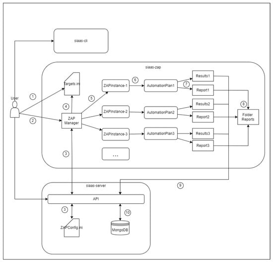 - SIAAS-ZAP: This module handles the integration with ZAP, automating the scanning of Web applications for vulnerabilities. It ensures that multiple targets can be analyzed concurrently by creating separate instances of ZAP for each target.