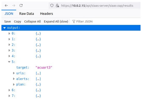 - Results: Once the analysis is complete, the SIAAS-ZAP module generates two types of reports: a detailed ZAP report and a JSON file with four main components (target, URLs, alerts, and plan). The target component identifies the application being analyzed, while the URL component lists all discovered URLs from the Spider and Ajax Spider processes. The alerts component contains all the vulnerability alerts triggered during both passive and active scans. The plan component summarizes the automation process, showing whether the scan was executed as expected and providing details about the duration and execution of each job. These results are accessible through the API and command-line interface, allowing users to view scan progress and outcomes.