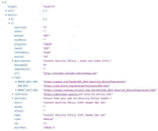 The developed system identifies potential vulnerabilities in targets and generates alerts, which are presented to the user. These alerts include key attributes such as risk, alert, description, tags, confidence, and solution, as shown in Figure 7. The alert field specifies the category or class of vulnerability associated with the alert. The confidence field indicates the scanner’s level of certainty about the triggered alert, with levels categorized as high, medium, and low. The description provides the rationale behind the alert, while risk assigns a severity level to the vulnerability, ranging from high, medium, and low to informational. The solution field offers potential remediation to address the identified vulnerability. Lastly, the tags field maps the detected vulnerability to OWASP and CWE taxonomies, providing links for detailed information. It is essential to clarify that the system does not validate the existence of the vulnerabilities; its primary function is automating their detection. The confidence field plays a crucial role by guiding the user on the likelihood of the identified vulnerabilities. Specifically, a high level suggests that ZAP has clear evidence of a successful attack or a lack of security mechanisms, indicating a strong probability of vulnerability. A medium level indicates the presence of signs of a vulnerability without confirmation of exploitation. Finally, a low level implies suspicious behavior or configuration errors detected by ZAP but with no definitive proof of exploitability.
