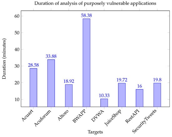 Looking at the graph in Figure 8, we can conclude that the duration of the analyses carried out on the purposely vulnerable applications were all relatively quick (less than an hour), with the “bWAPP” target having the longest analysis of around 58.38 min. The majority of the scans took less than 20 min to complete, with the average duration of scans on purposefully vulnerable applications being approximately 25.7 min.