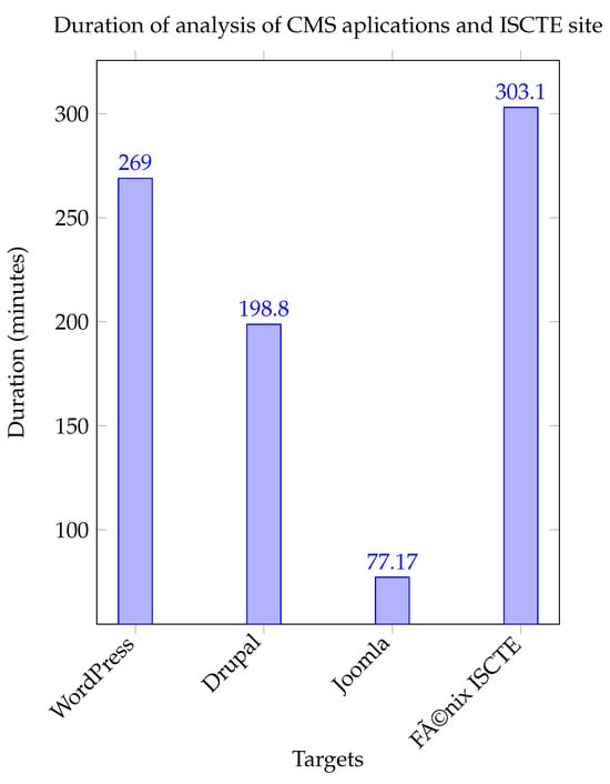 With regard to the duration of the analyses carried out on the Fenix Iscte target and the CMSs, these results were much longer than the times for the first group of applications tested. As we can see in Figure 9, the longest duration was that of the real site, Fenix Iscte, at 303.1 min, about six times longer than the average of the purposely vulnerable applications. This difference can be explained by the fact that these applications are larger and have complex authentication and permissions logic, which naturally requires more processing time for an exhaustive analysis. Purposely vulnerable applications, on the other hand, are simpler and designed to facilitate fault detection, resulting in shorter analysis times.