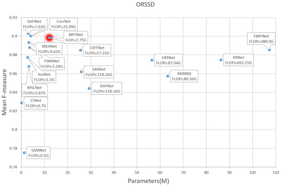In spite of the advances made by current methodologies in ORSI-SOD, challenges remain concerning the quantity of parameters and computational load. Current approaches frequently contain numerous parameters and are computationally intensive, posing challenges for deployment on mobile devices. As shown in Figure 1, six leading ORSI-SOD methods (SARNet [16], DAFNet [17], MJRBM [18], ERPNet [19], RRNet [20], and EMFINet [21]), and nine lightweight SOD methods (CSNet [22], SAMNet [23], MSCNet [24], FSMINet [25], CorrNet [26], SeaNet [27], MEANet [28], CSFFNet [29], and SAFINet [30]) were evaluated on the ORSI dataset. Cutting-edge methodologies with ORSI-SOD techniques have impressive performance, but their high performance often comes with substantial computational demands, rendering them unsuitable for deployment on mobile devices. In practical applications, certain scenarios require real-time responses to changes in user input, which lightweight models can provide more efficiently on mobile terminals. Figure 1 also demonstrates that the nine lightweight SOD methods aim to address computational inefficiency but, unfortunately, often at the expense of some performance. This highlights the primary challenge currently faced by ORSI-SOD: attaining an ideal equilibrium between accuracy and efficiency. Since it is a fairly specialized topic, this work will generally not be of interest to a broad variety of academics and experts. Naturally, as the algorithm is refined for faster streaming speeds and greater sample resolutions, the technique may find broader use in computer vision applications.