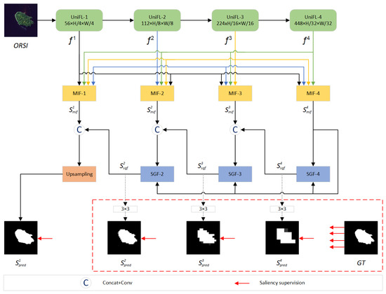 Traditional SOD methods primarily rely on hand-crafted features, including image contrast, brightness and color. While these methods can be effective in certain scenarios, their performance frequently fails to meet the desired standards when dealing with scenes of considerable complexity, especially when backgrounds and objects have similar brightness and color features or when objects are partially occluded. This limitation arises mainly because these methods fail to completely utilize multi-scale information and high-level semantic features within images. In the contemporary period of deep learning, researchers have proposed a large number of deep-learning-based SOD methods, particularly for NSI, leading to significant improvements in detection accuracy. Notably, among the various methods, the classic encoder–decoder architecture [6] emerges as the most universal and efficacious structure. They often incorporate various strategies to enhance performance, such as edge assistance [7], gating mechanisms [8], progressive architectures [9], and deep supervision [10]. Even though NSI-SOD models cannot directly address the complexities of ORSI environments, the strategies employed in these models lay a solid foundation for designing specialized ORSI-SOD models.