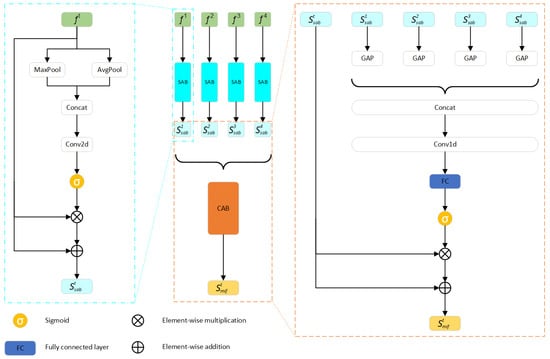 As illustrated on the right in Figure 3, the CAB generates more comprehensive attention feature maps by dividing the fusion of multi-stage features into two parts: local feature integration, which employs convolutional processing, and global feature integration, which leverages distinct fully connected layers at every stage. This dual approach enables the CAB to extract both detailed and broad-spectrum information effectively. The operation of the CAB can be mathematically expressed as follows: