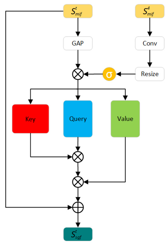 To tackle this issue, we have introduced the Semantic Guidance Fusion (SGF) module within the decoder. The SGF module leverages deep-layer features that are rich in semantic information to generate a semantic guidance map, which serves as prior information for guiding the fusion of low-layer features. Through a self-attention mechanism, the SGF explores the projection correspondence of both global information and local features, infusing global semantic information into local features, thereby significantly enhancing the feature representation capability. This mechanism filters out unimportant parts from a large amount of information, focusing on processing and selecting key important information, thus strengthening the model’s awareness of global information and capturing long-distance dependencies.