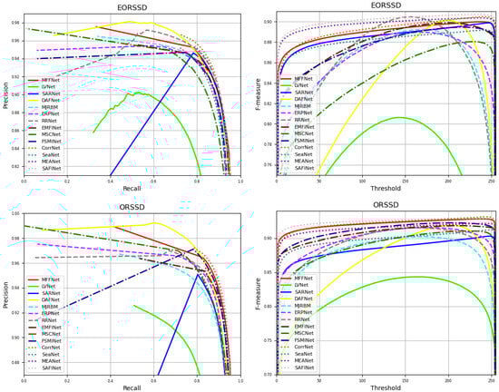 Additionally, Figure 5 presents the precision–recall (PR) and F-measure curves for 13 ORSI-SOD models (LVNet, SARNet, DAFNet, MJRBM, ERPNet, RRNet, EMFINet, MSCNet, FSMINet, CorrNet, SeaNet, MEANet, and SAFINet), as well as the proposed MFFNet. The curves for the proposed MFFNet model are highlighted in red to ensure clarity and ease of comparison. As visible in the evaluation plots, the proposed model (marked by the red curve) consistently positions itself nearer to the top-right corner in both datasets. This positioning indicates superior performance metrics, suggesting that our method exceeds most other approaches with respect to precision and recall.