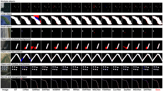 The third row illustrates a scenario involving small objects, where accurate detection is particularly challenging. In this scene, MSCNet, SeaNet, and SAFINet erroneously detect more regions, whereas other methods only offer a rough localization without detailed detection. Conversely, our method accurately identifies and segments the small object with high precision and fine detail.