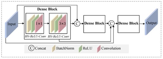 where represents a series of nonlinear transformations of the dense block, and is the concatenation operation.