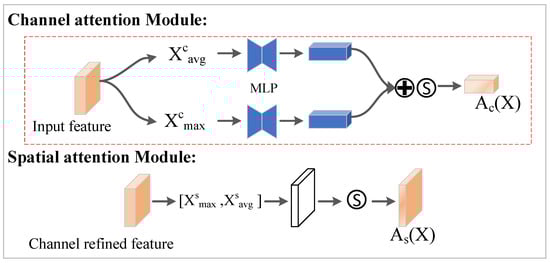 The AGM progressively generates a channel attention map, denoted as , followed by a spatial attention map, , as illustrated in Figure 3. The channel attention calculation is given by