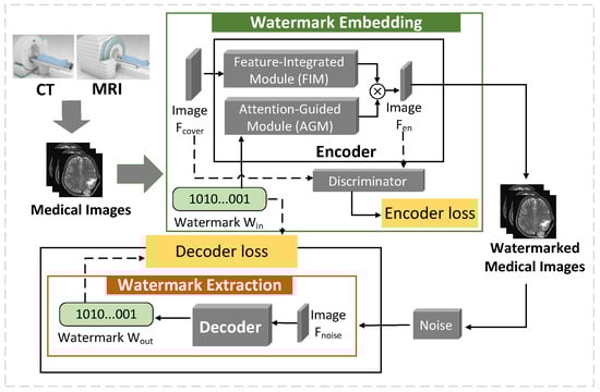 Deep learning has achieved remarkable progress in medical image processing tasks like classification and segmentation, owing to its ability to capture and represent intricate patterns [,]. In contrast to traditional machine learning methods, deep learning models autonomously learn complex features from images, enabling better generalization across various scenarios when trained on extensive datasets. This capability has also been successfully applied to the field of medical image watermarking. Current deep learning models for medical image watermarking primarily utilize convolutional neural network (CNN) architectures. An advanced CNN-based watermarking approach incorporates an iterative learning framework to enhance the robustness of embedded watermarks, building upon the frequency-domain methods traditionally used in watermarking. One such example is ReDMark, a comprehensive deep learning framework for diffusion-based watermarking that can adapt to various transform domains []. ReDMark utilizes two fully convolutional networks with a residual design and integrates a differentiable network layer to simulate diverse attacks, enabling efficient end-to-end model training.