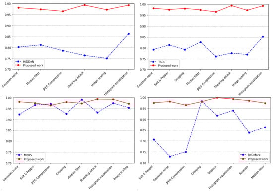 Medical images are crucial for accurate diagnoses, but traditional watermarking algorithms compromise image quality and lack robustness against high-intensity attacks. Fan et al. [] proposed a novel watermarking algorithm using CNN Inception V3 and DCT to preserve image quality and improve robustness, achieving over 90% accuracy in experimental tests under various geometric attacks. Geometric attacks refer to manipulations or transformations of an image that alter its geometric properties, such as position, orientation, or shape, aiming to distort or remove the embedded watermark without significantly degrading the image quality. Zhang et al. [] presented a robust multiwatermarking algorithm for medical images, using GoogLeNet transfer learning to enhance privacy protection during transmission and storage while improving resistance to geometric attacks and increasing watermark capacity. By fine-tuning a pretrained GoogLeNet model and employing two-dimensional Henon chaos encryption, the algorithm achieved zero-watermark embedding and blind extraction, demonstrating its robustness and multiwatermark embedding in experimental tests. Nawaz et al. [] proposed a zero-watermarking method for medical images using DWT, ResNet101-DCT, and chaotic scrambling for encryption. By extracting deep features with ResNet101 and applying XOR operations, the algorithm demonstrated its robustness against conventional and geometric attacks, ensuring effective ownership verification. Nawaz et al. [] introduced a zero-watermarking method for encrypted medical images using DWT, DCT, and an improved MobileNetV2 convolutional neural network. The technique enhances robustness by encrypting watermarks with a logistic map system and hash function, showing superior resilience and invisibility against conventional and geometric attacks in experimental results.