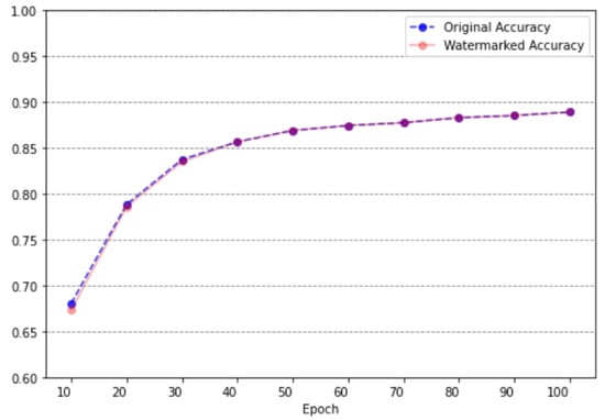 The results, shown in Figure 10, indicate that the test accuracy for the watermarked dataset remained consistently close to that of the original dataset across all epochs. This close alignment demonstrates that the AGFI-GAN watermarking method preserves the integrity of image features essential for classification. The negligible difference in accuracy between the two datasets supports the conclusion that our watermarking approach does not negatively impact classification performance, confirming its suitability for medical image authentication and protection without compromising the effectiveness of subsequent diagnostic tasks. This result aligns with the findings of Ahmed et al. [], who conducted a comprehensive investigation into the impact of watermarking on classification accuracy. Their results demonstrated that, although watermarking can slightly affect image quality due to increased scaling factors, its influence on classification accuracy remains minimal. Both our study and theirs demonstrate that digital watermarking can seamlessly integrate with deep learning-based image classification models without significantly compromising performance of tasks in medical imaging analysis.